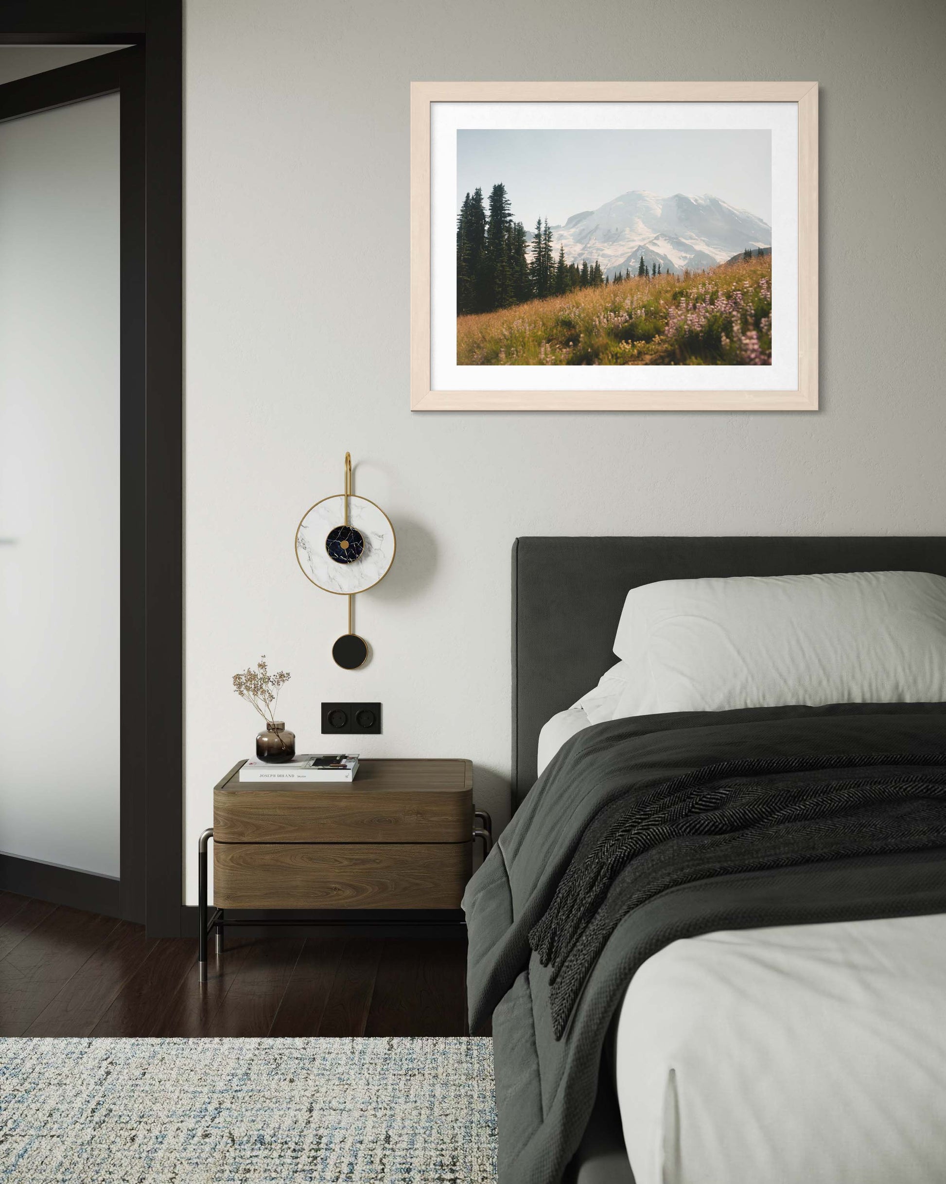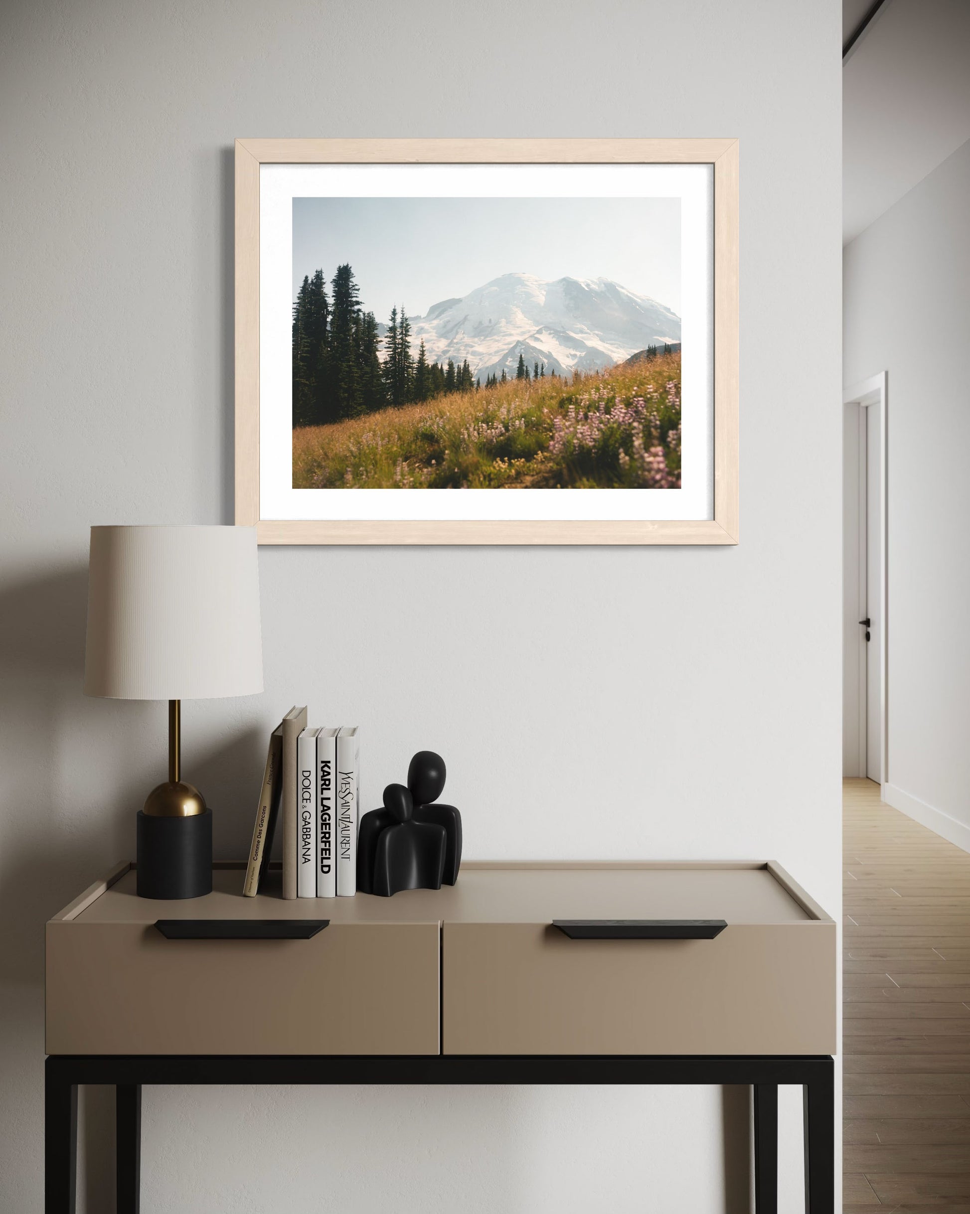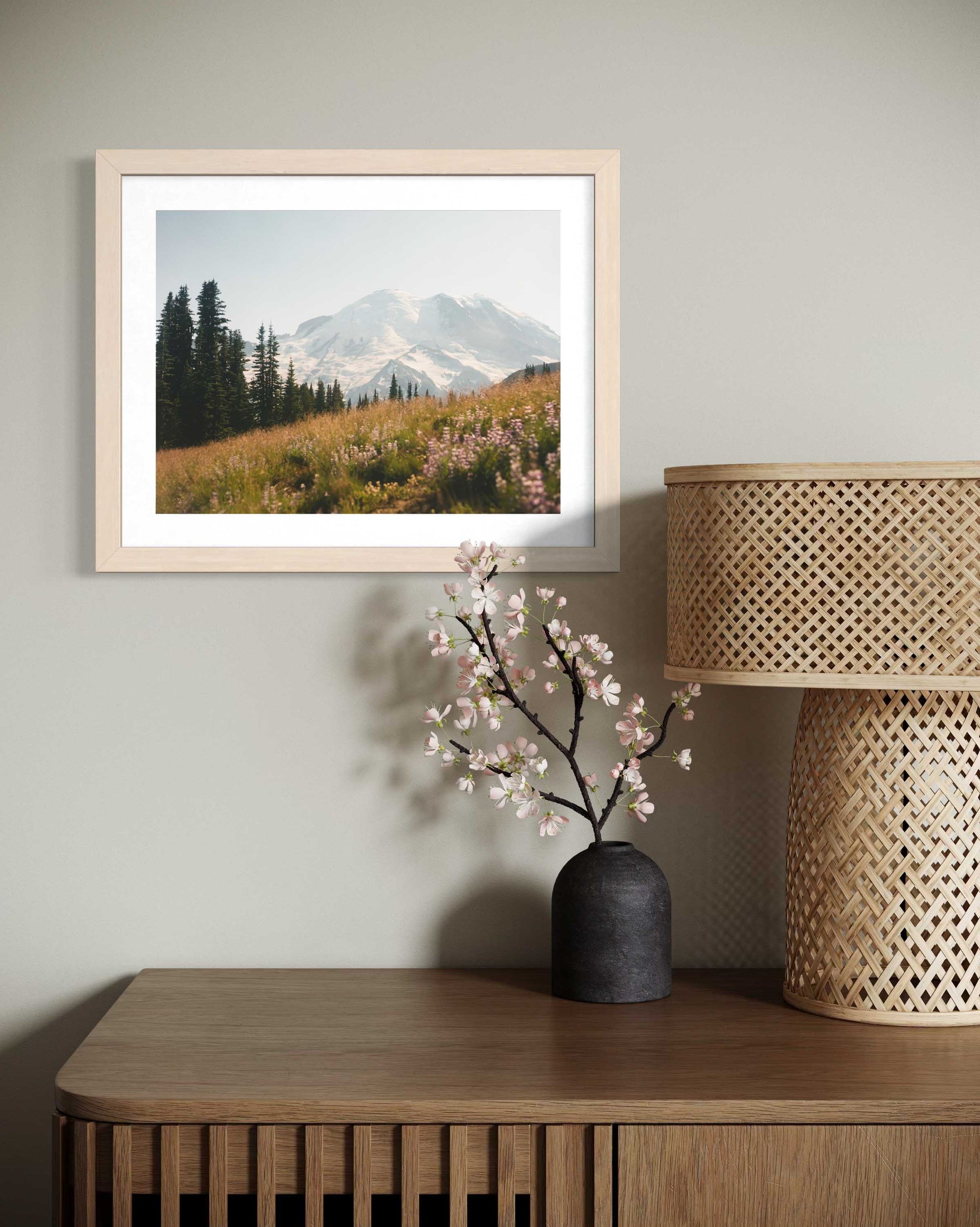 Bring a little summer magic into your space. Mount Rainier in Bloom captures the mountain at its most peacefulâframed by wildflowers and glowing in soft, natural light. Shot with a vintage film camera.