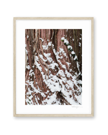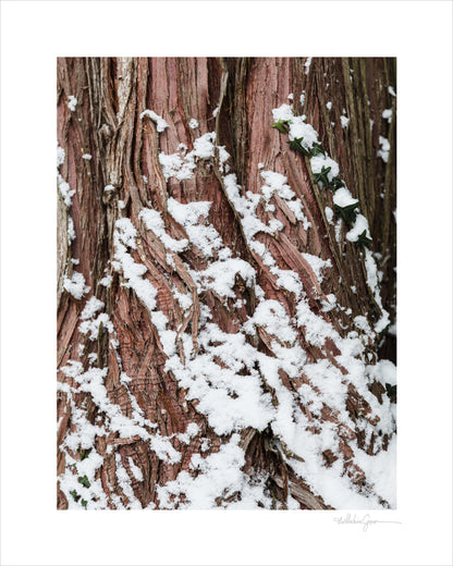 Enjoy the quiet drama of winter with Snowy, featuring the rich, fibrous bark of a Western Red Cedar contrasted against fallen snow. Captured in Seattle, this moment blends texture, color, and stillness in a uniquely Pacific Northwest scene.