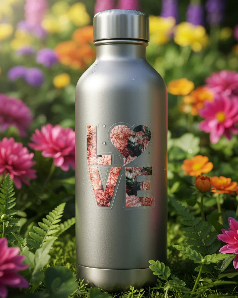 Clear LOVE sticker features stunning dahlias, a perfect way to add floral beauty to any surface (shown here on linen).